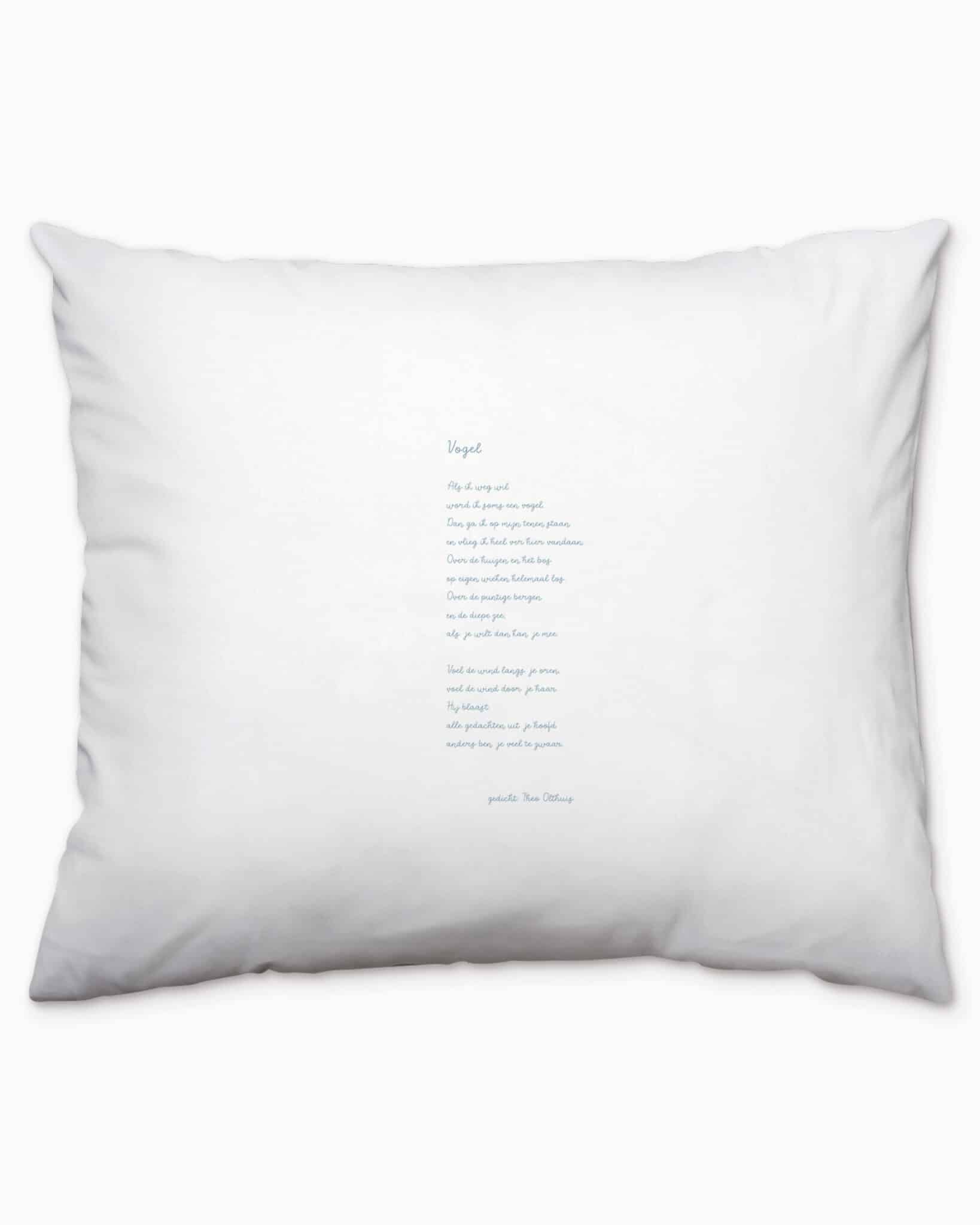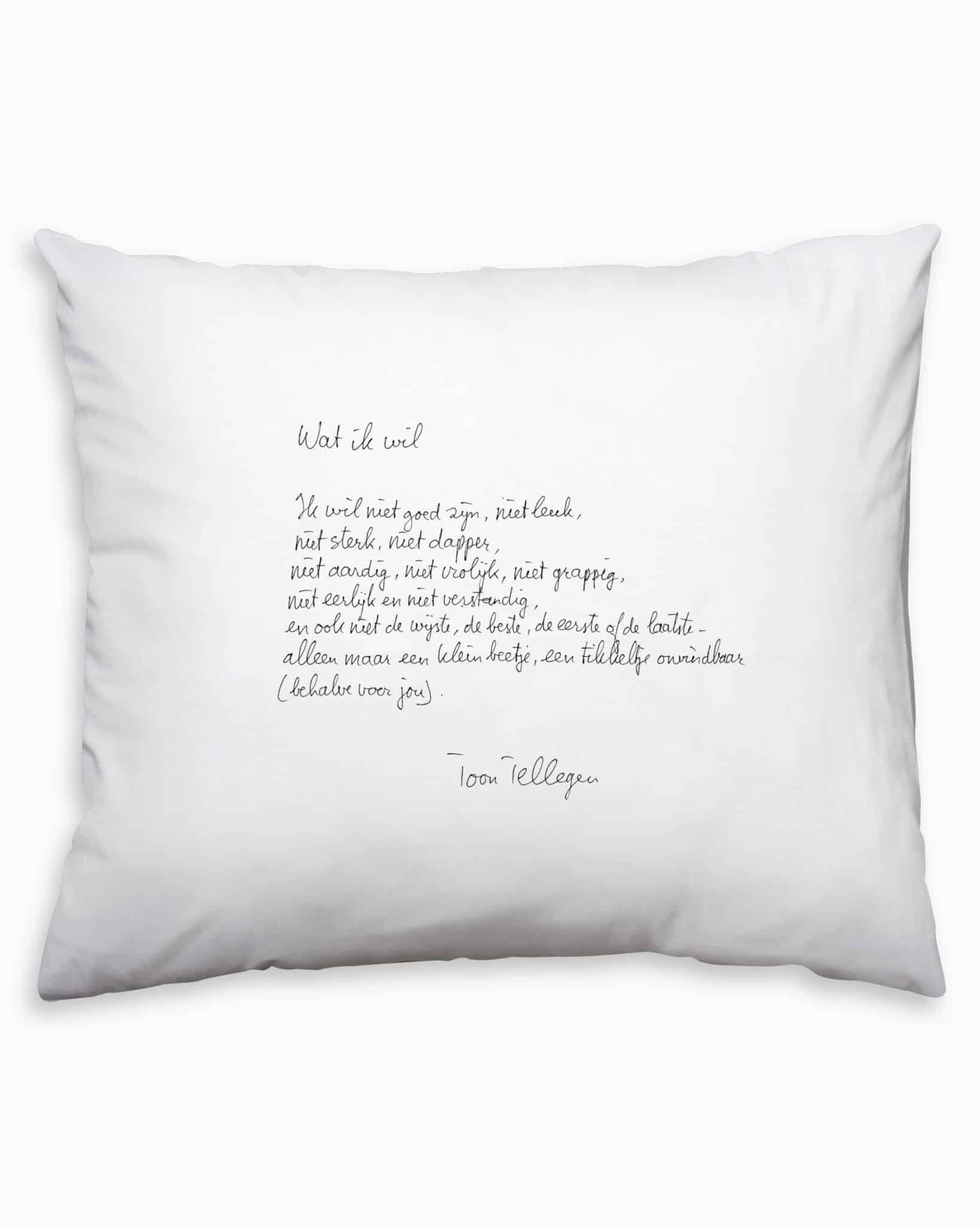 Met de hand gedrukt op een kussensloop van eerlijk katoen.