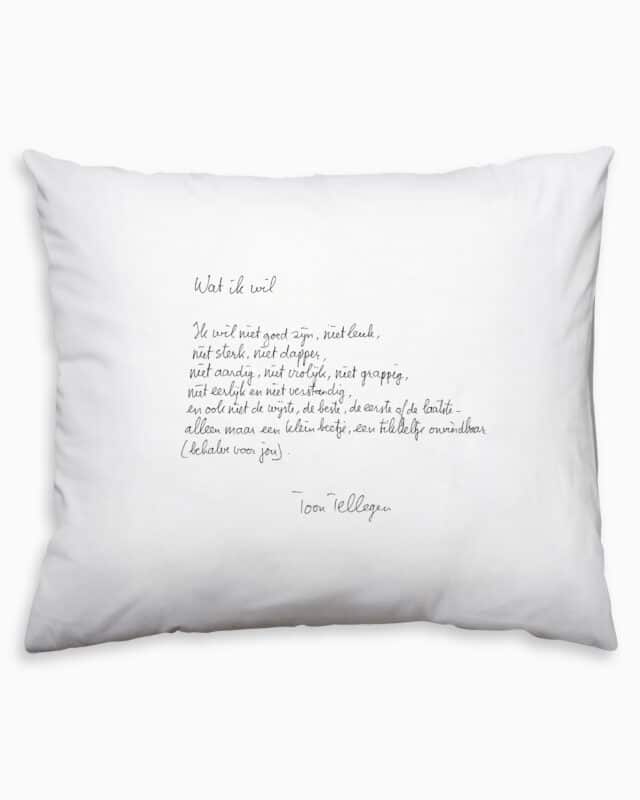 Met de hand gedrukt op een kussensloop van eerlijk katoen.